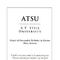 A.T. Still University School of Osteopathic Medicine in Arizona Commencement Program; 2011 June 3. Glossy navy blue front and back covers, silver border on cover, silver lettering on cover, white interior pages, black text, ATSU School of Osteopathic Medicine in Arizona Commencement Program lists itinerary of commencement, candidates for graduation for the KCOM Class of 2011; 13.9 cm (w) x 25.4 cm (h). 24 pages. No visible damage.